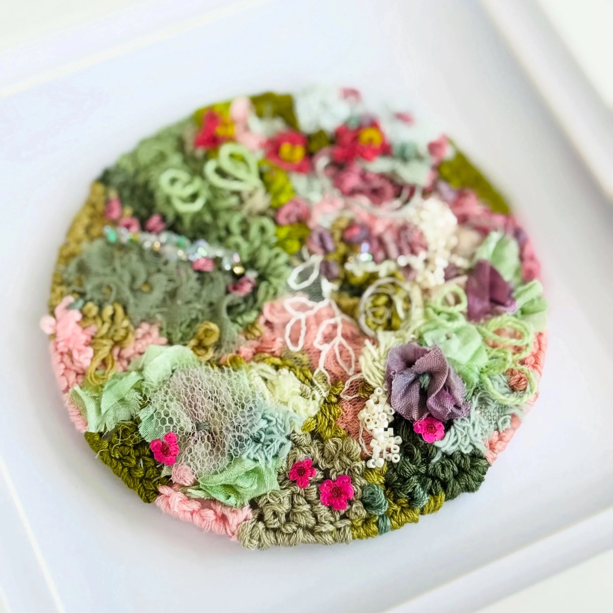 By the end, you’ll have a unique, textural embroidery piece to frame (choose to make a circle from 6cm- 12cm)